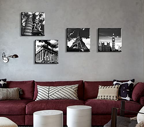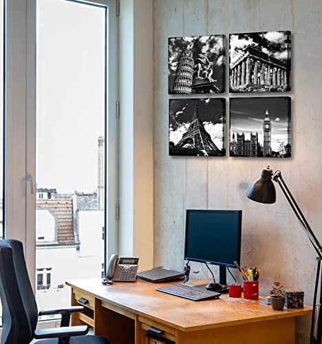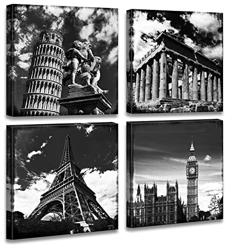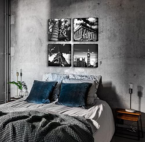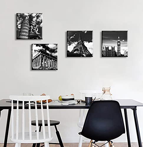 JiazuGo - Black and White Building Wall Art for Living Room Contemporary European Famous Architecture Leaning Tower of Pisa Eiffel Parthenon London Elizabeth City Big Ben Canvas Pictures Paintings Christmas