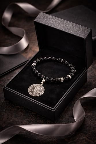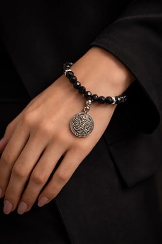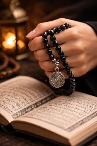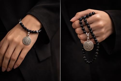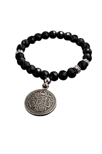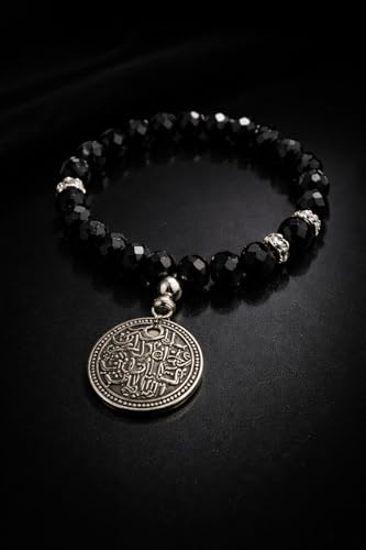 Generic - سوار خرز اسود مع دلاية على شكل عملة عربية، خرز متعدد الاوجه، لمسات فضية، مسبحة صلاة اسلامية