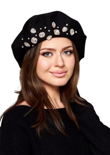 Generic - Black Beret Hat with Crystals, Elegant Women Hat with Shiny Embroidery