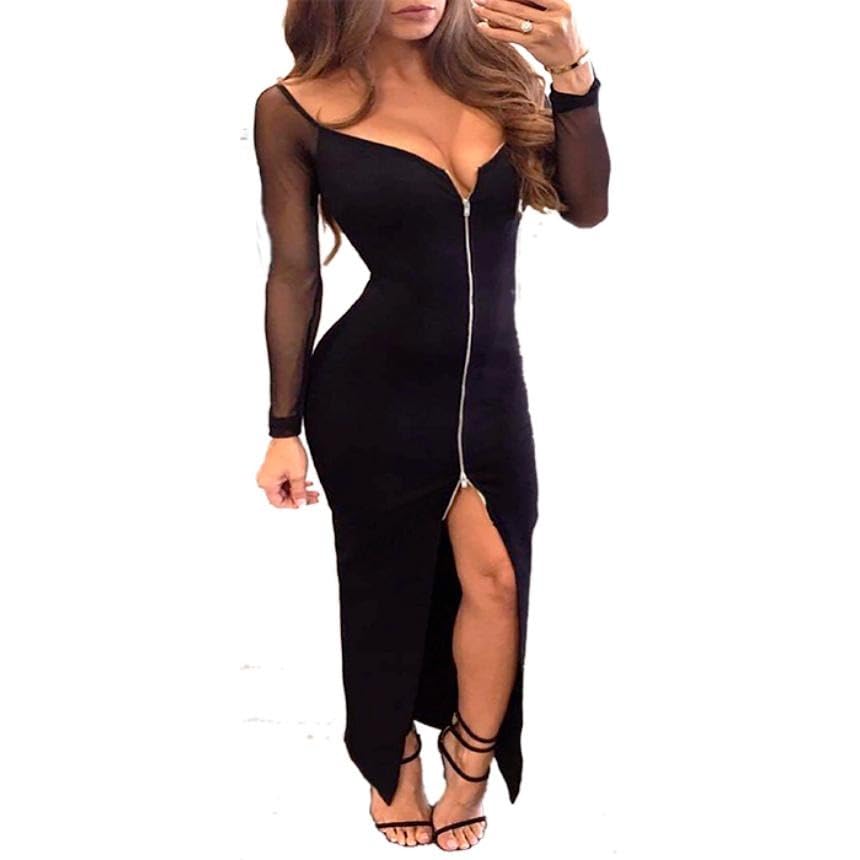 Generic - Black Front Zipper Transparent Tulle Long Lingerie Dress