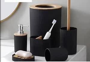Generic - طقم حمام أسود مضلع، ٦ قطع، مع تفاصيل خشبية، موزع صابون، حامل فرشاة أسنان، حامل صابون