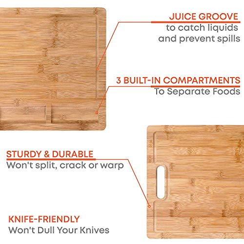 - Our extra large cutting board has a deep juice groove to prevent leaking on the countertop, 3 built-in compartments to separate foods, and a side handle to easily move around and store