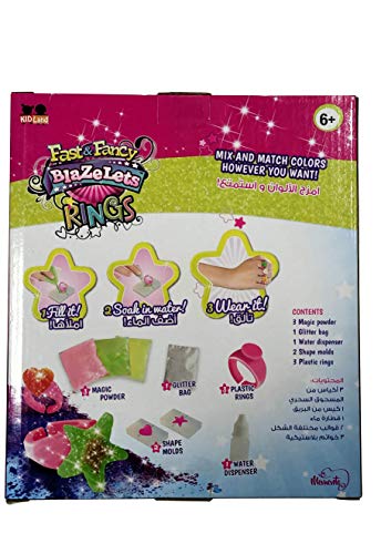 - Set includes: 1 heart shape mold, 1 star shape mold, 3 rings, 3 magic powder bags in assorted neon colors, 1 water dispenser, 1 glitter bag, and instructions
