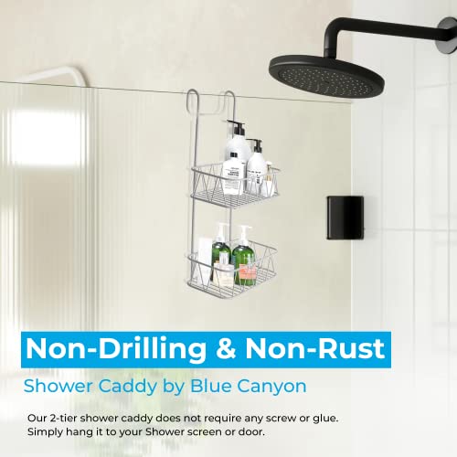 - 【 NO-DRILL BATHROOM STORAGE 】: Blue Canyon Shower Caddy is easy to install. Our 2-tier shower shelf does not require any screws or glue. All you have to do is, hang it on your shower glass or door. This bathroom caddy can also move around if required.