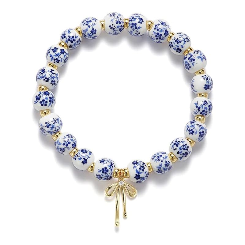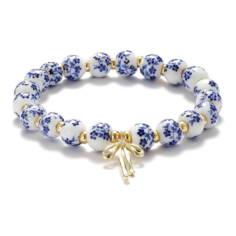 fashion mania - Blue Ceramic Bead Bracelet With Diamond Bow And Blue And White Porcelain Bracelet
