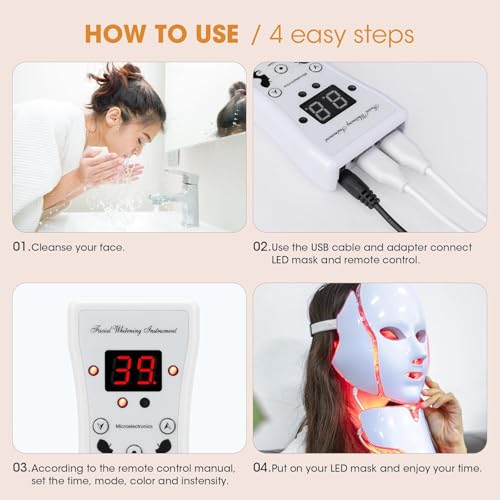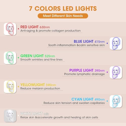 - لقد صممنا قناع ضوء LED هذا ليناسب نمط حياتك النشط، يمكنك بسهولة القيام بالعلاج بالضوء الفوتون للوجه بنفسك. يعتمد علاج الوجه بإضاءة LED على موجات ضوئية مرئية للوصول إلى البشرة، اختر الضوء المناسب وفقًا لاحتياجات البشرة. 7 مصابيح ليد باللون الأحمر والأخضر والأزرق والأرجواني والأصفر والأزرق السماوي والأبيض تساعد على تحفيز إنتاج الكولاجين وتحسين حيوية البشرة.