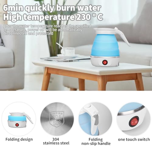 - ANTI-OVERHEATING PROTECTION: The silicone electric kettle offers anti-overheating protection and automatically turns off when the water reaches the boiling point. This foldable electric kettle will automatically turn off when you find that there is no more water, saving energy and protecting your safety.