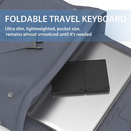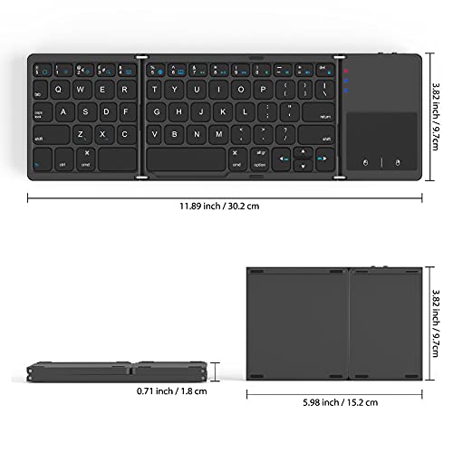 - Compact & Portable Keyboard: This is a triple folding keyboard which is made of durable aluminum. You do not need to worry about daily wear and scratches. Its unfolded size is 30.4*9.8*0.8cm, while folded size is 15.2*9.8*1.8cm. It can be folded up and placed in a pocket or bag without occupying too much space. The weight is only 197.3g, easy to be carried everywhere. The elegant matte design is perfect for your tablet, phone and laptop, etc.