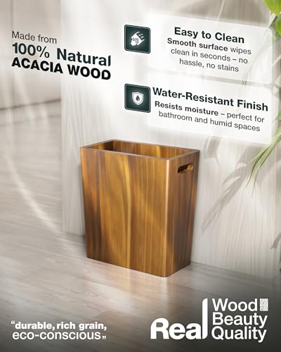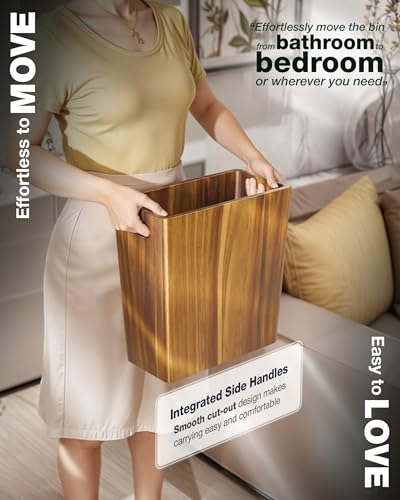 BLUEWEST - BLUEWEST 2.6 Gallons Wooden Wastebaskets – Solid Acacia Wood Trash Can with Handles, Rectangular Bin for Bathroom, Bedroom, Kitchen, Office – Brown Decorative Basket for Living Room or Under Counter