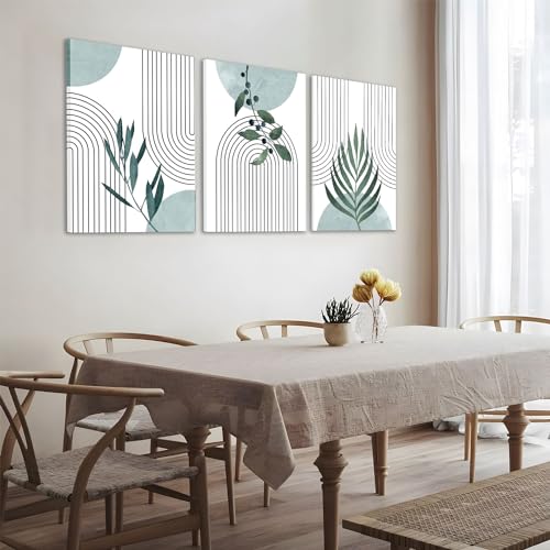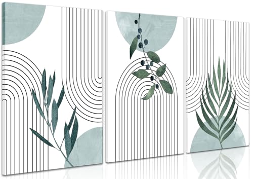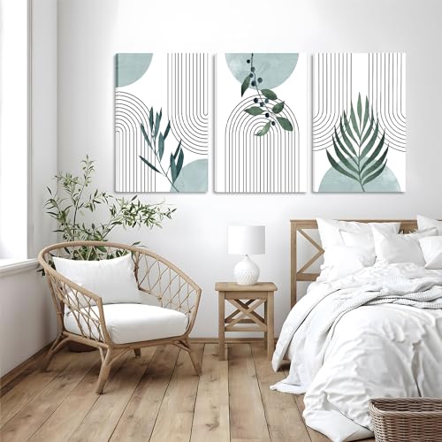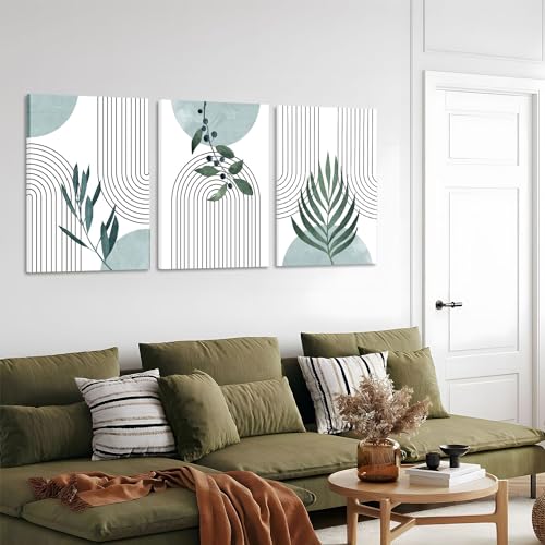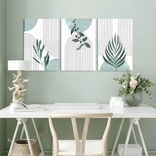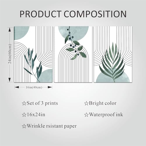 AKWISH - Boho Botanical Canvas Wall Art Set of 3, Minimalist Green Sage Art Painting, Geometric Line Poster Prints Wall Decor for Living Room, Bedroom, Office, Home Decor - Framed 16x24 In