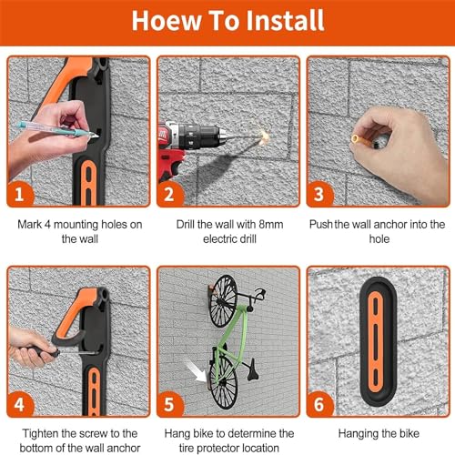 - 💥【Packing List】Bike Rack x 1, tire tray x 1, Screws x 4, Anchor X 4 Note: The bike storage system require to install on the stud, masonry or concrete wall, do not mount on plasterboard unless there is a stud behind it.