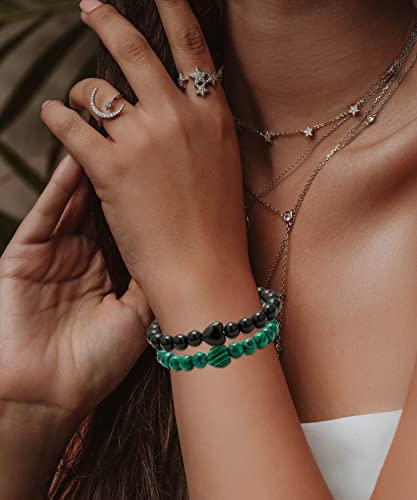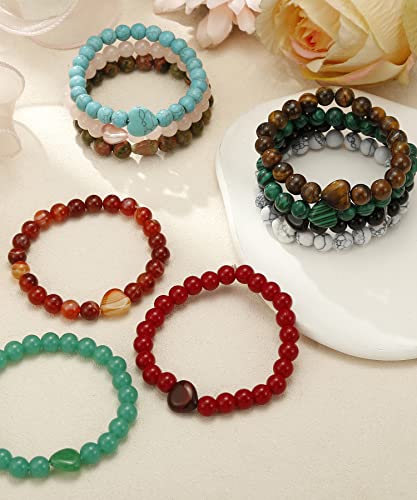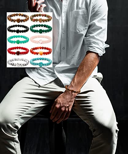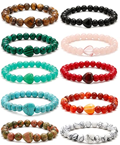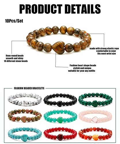 BOMAIL - بوميل 10 قطع سوار خرز على شكل قلب - احجار كريمة طبيعية شبه ثمينة كريستالات ريكي العلاجية مصنوعة يدويا 8 ملم خرز دائري قابل للتمدد، سوار هدايا