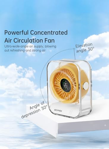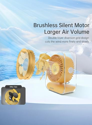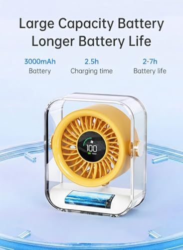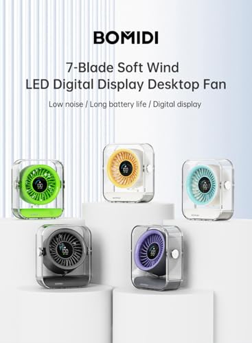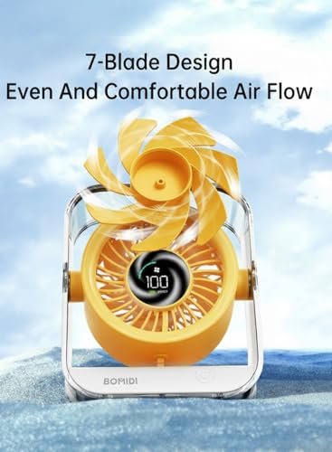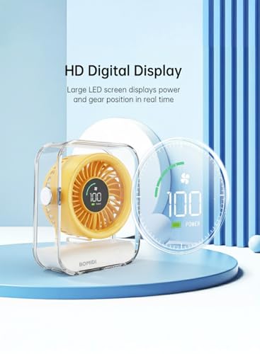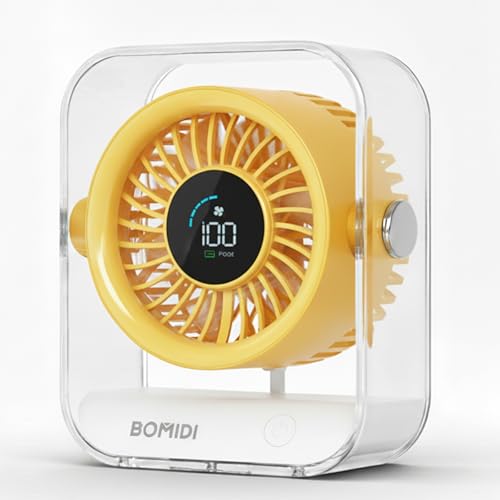 BOMIDI - مروحة مكتب مع شاشة رقمية من بوميدي، تعمل ببطارية 3000mAh، مروحة تبريد هادئة بـ7 شفرات، دوران هواء بزاوية واسعة 60 درجة، 3 سرعات للمكتب والمنزل وغرفة النوم - اصفر
