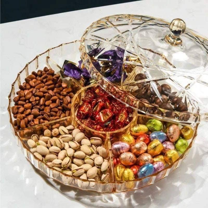 • تصميم معين: طبق تسالي / بونبونيره متقسم بغطاء يتيح تنظيم مكسرات، حلويات، كحك، وبسكويت.