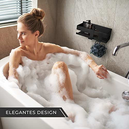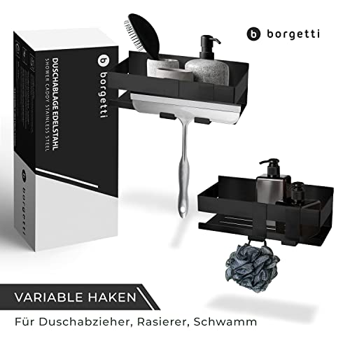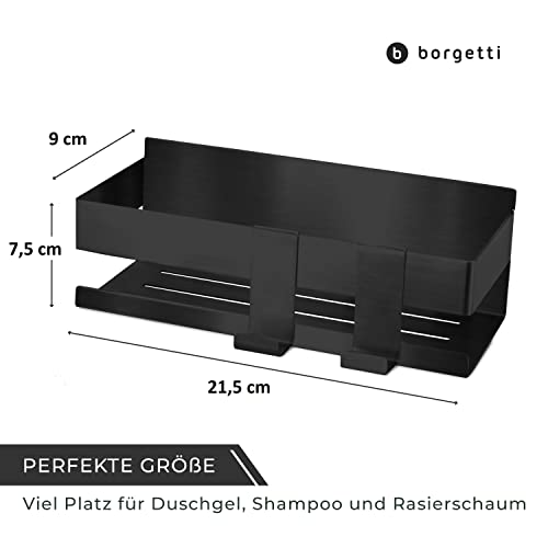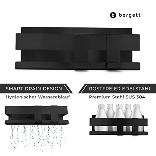 BORGETTI - BORGETTI Shower Shelf without Drilling - Matte Black - Super Strong with 3M Adhesive Tape - Stainless Steel - as Shower Basket / Shampoo Holder / Bathroom Shelf or Spice Rack - Includes 2 Hooks