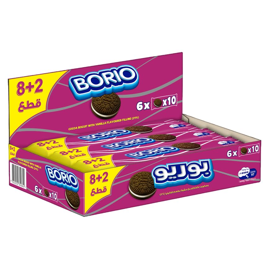 BORIO - بسكويت بالشوكولاتة مع حشوة كريمة الفانيليا من بوريو، 10 قطع، (8+2) عبوة من 6 قطع (50 غرام)