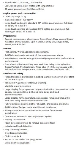 - Special programmes: allergy plus, Drum Clean, Easy Ironing Steam Assisted, shirts/blouses, Spin / Drain, Family Mix, single rinse, Duvet, Quick 15'/30'