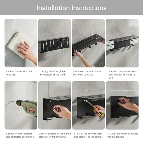 - 【Versatile Storage】This adhesive shelf offers versatile storage options for various areas of your bathroom,laundry rooms,and kitchens,keeping shampoo,shower products,and other bathroom essentials organized.