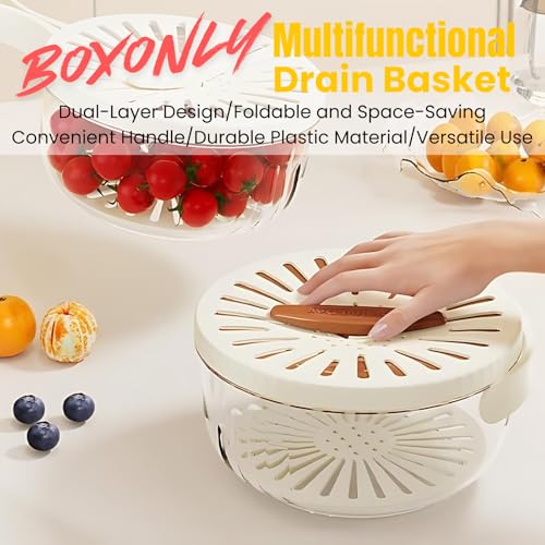 Boxonly - Multifunctional Fruit and Vegetable Washing Bowl with Lid – 2-in-1 Plastic Drain Basket with Foldable Handle, Colanders and Strainers for Kitchen Use (Brown, 2 Pcs)