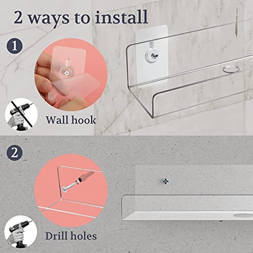 - [Easy to Install] - Two Installation Methods: Different from other floating shelves, our acrylic floating shelves can be installed by punching holes, or directly fixed to the wall by the wall hooks we provide. You can choose the installation method according to your wall characteristics. The durable, sturdy acrylic floating bookshelf can meet all your storage display needs.