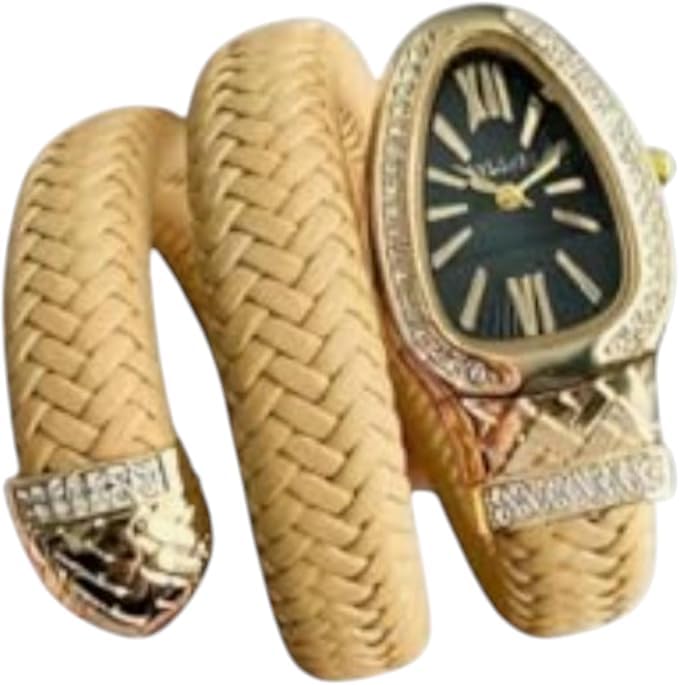 Braided Leather Strap, Crystal-studded Frame, Gold-plated Frame, Quartz Movement, Snake Wrap Design