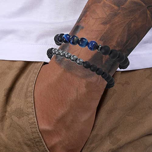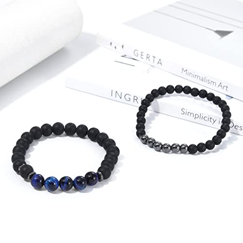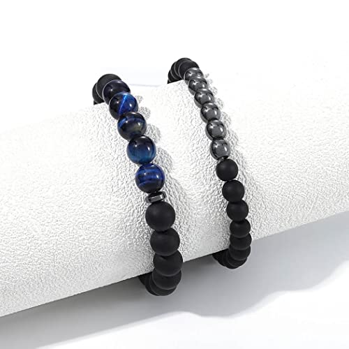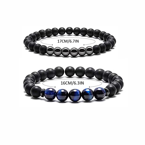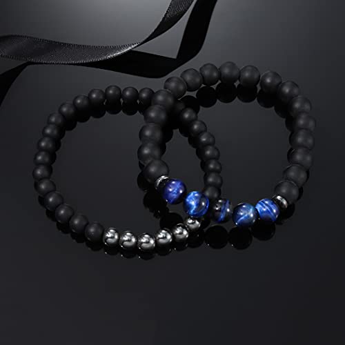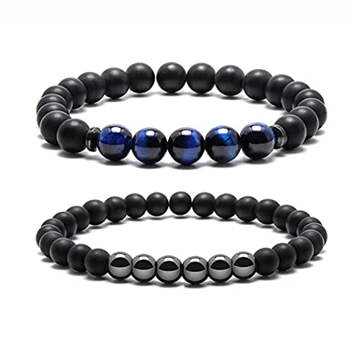 Branets - Tiger Eye Stone Bracelet Distance Bracelet Black Matte Agate & Silver Steel Ball Energy Natural Stone Beads Bracelet Set Relationship Couples Jewelry Women and Men, Stone, Agate