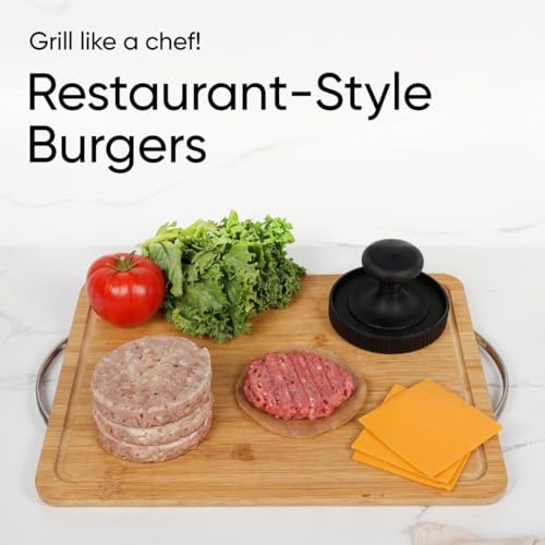 - HAMBURGER PRESS PATTY MAKER: Craft perfectly sized 4.5-6" hamburger patties with ease using our hamburger press patty maker, streamlining your burger preparation process. Simple design with round hamburger press patty papers included, 4.7”, it requires no assembly and is an efficient tool to shape meat into perfectly round patties in no time.
