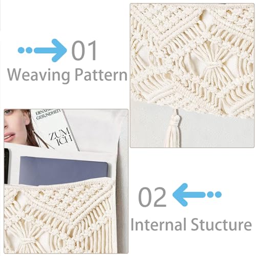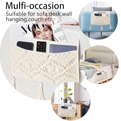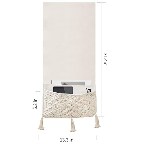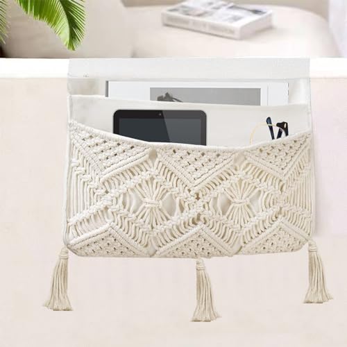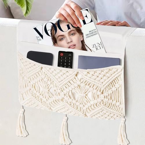 Brmeday - Macrame Sofa Armrest Organizer Remote Control Holder Couch Bedside Armchair Caddy Storage Basket Bag for TV Remote Control, Magazine, Books, Cell Phone, iPad, Boho Home Dorm Decor, Ivory
