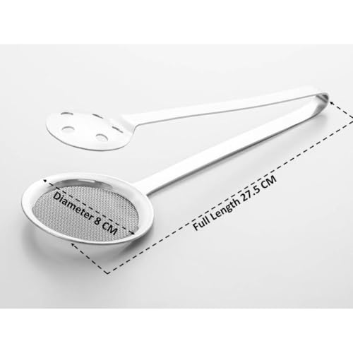 - Optimal Size and Handling: With dimensions of 26 X 9 X 2 CM, this kitchen equipment fits comfortably in your hands. The long handle colander spoon enables easy manipulation, while the filter spoon with clip ensures safe and precise operation in any kitchen.