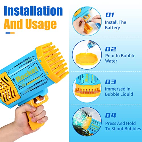 METINI - مسدس صنع الفقاعات مزود بـ 69 فتحة، ماكينة فقاعات على شكل بازوكا مع ضوء، قاذف فقاعات صاروخي للعب، ألعاب نفخ الفقاعات للأطفال للاستخدام في الداخل والخارج (لون أزرق)