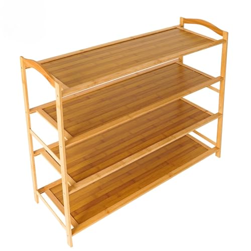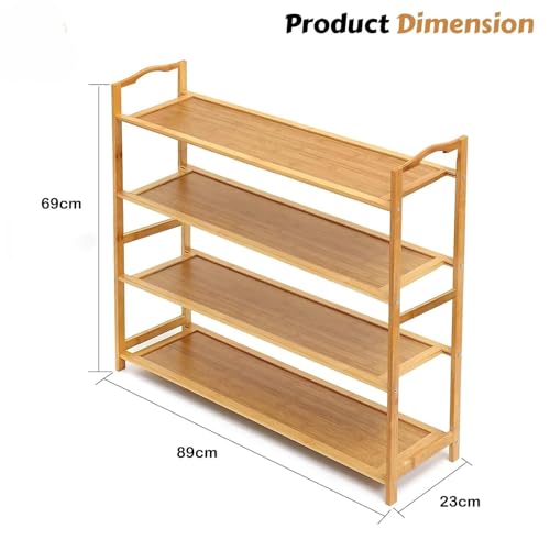 - Our shoe shelf is made of high quality natural bamboo, environmental friendly and easy to clean. The bamboo shoes rack have strong bearing capacity, and the layer board can prevent stuff falling down from the gap. The size of 4 tier shoes stand is 89 x 23 x 69cm, which is large and suitable for home and office.