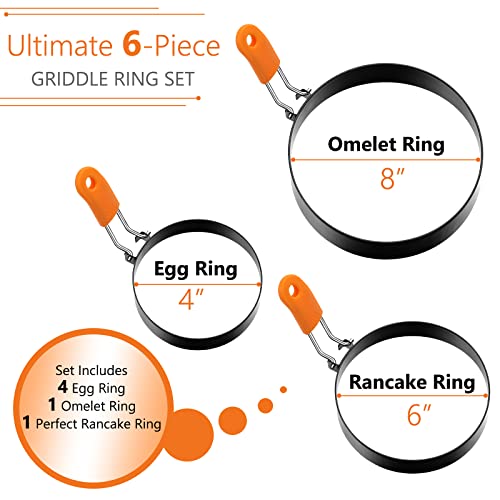 Bukela - 6 Pcs Professional Egg Ring Pancake Ring Set Stainless Steel Fried Egg Ring Griddle Pancake Shapers with Silicone Handle for Breakfast Omelette Sandwich (4, 6, 8 Inch)