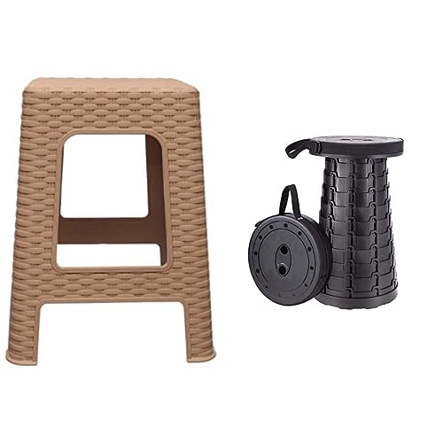 Generic - مجموعة مقاعد بلاستيكية - بيج + مقعد قابل للطي، كرسي محمول قابل للطي، كرسي قابل للسحب، للتنزه في الهواء الطلق، صيد الاسماك، الصيد، الانتظار في الطابور بالحافلة