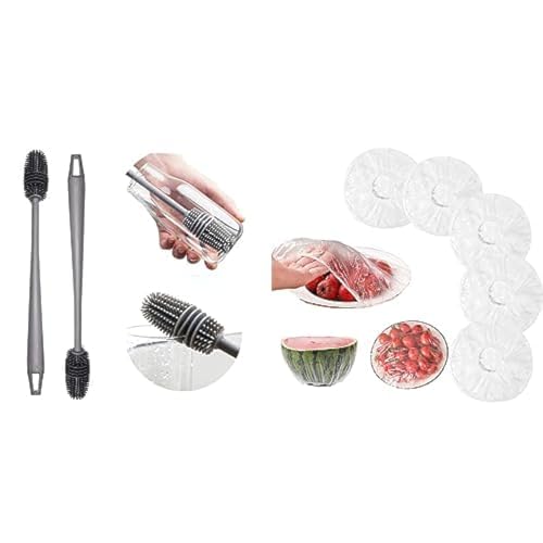 Other - مجموعة من فرشاة زجاجات المياه بمقبض طويل من السيليكون 12.5 انش لفتحات الزجاجات ذات القطر الاصغر (متعددة الالوان) + اكياس حفظ الطعام الطازج بغطاء 100 قطعة،