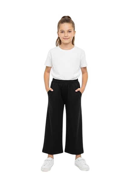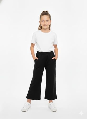 Buongiorno - Buongiorno Girls Wide Leg Pants, Black Cotton and Lycra Culotte Trousers, Elastic Waist Casual Bottoms with Pockets