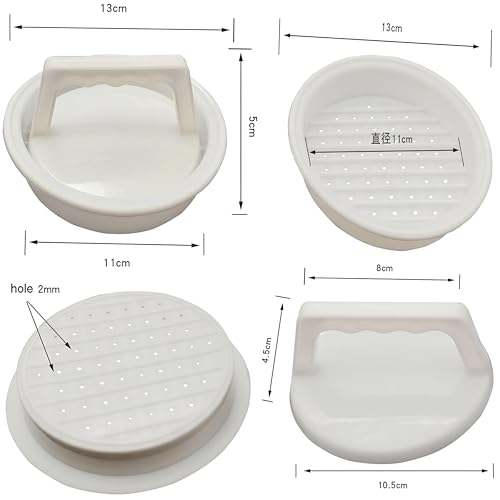 - تم تصميم القالب بقياسات دقيقة: المقاس 13 × 11 × 5 سم بقطر داخلي 11 سم، القطر الخارجي 13 سم، وقطر لوحة الضغط 10.5 سم. يساعد هذا المقاس الدقيق على تكوين فطائر كبيرة وسميكة ذات شكل متناسق، والتي تُطهى بالتساوي على الشواية وتتناسب تمامًا مع كعك البرجر.