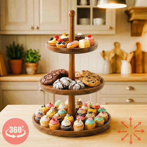 BURMAN - BURMAN Cupcake Stand Dessert Table Display Set – 2 in 1 Adjustable Height Rustic Natural Acacia Cupcake Holder Round Wood Tray – Three Tiered Serving Stand with Rotating Wheels, Anti Slip Stickers
