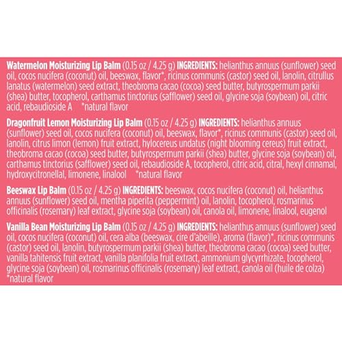 - FOUR REFRESHING FLAVORS: Delight the senses with Watermelon, Dragonfruit Lemon, Beeswax and Vanilla Bean flavors that will encourage you to apply flavored lip balm over and over again