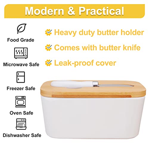 - MODERN & PRACTICAL:The ceramic butter dish presents a modern and simple look. It is designed with the stainless steel butter knife on top of the cover which makes it practical. This butter dish is an ideal tableware gift for any couple looking for a covered butter dish or butter keeper.