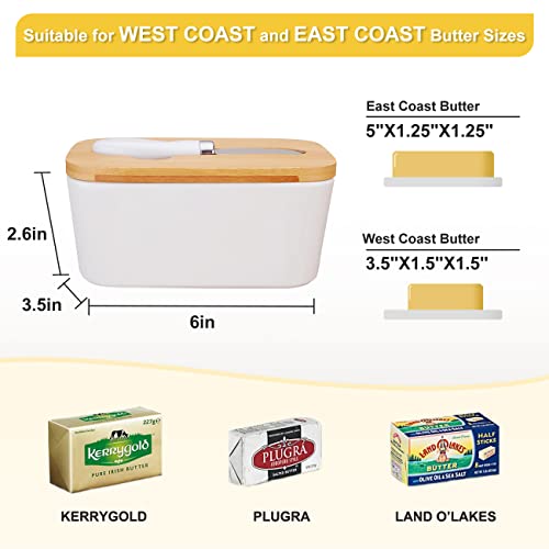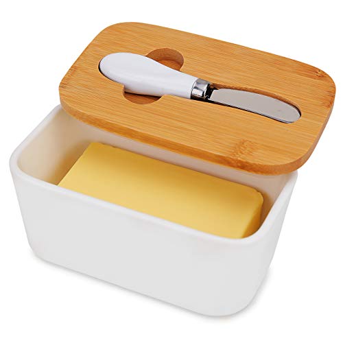 Kitchenexus - Kitchenexus Butter Dish with Lid, Ceramic Butter Keeper with Bamboo Cover & Steel Knife, Porcelain Butter Bowl Holder Container Perfect for Butter West or East Coast Butter