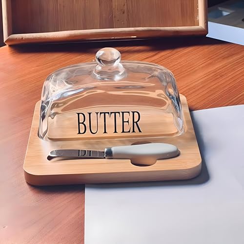 Generic - Butter Holder - Classic Wooden Base with Transparent Glass Cover, Includes Knife and Airtight Seal for Fresh Butter Storage