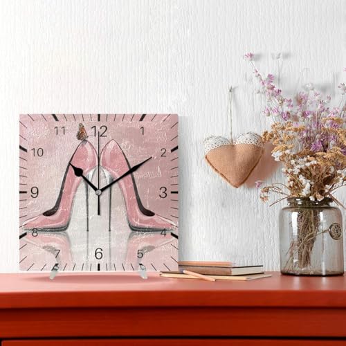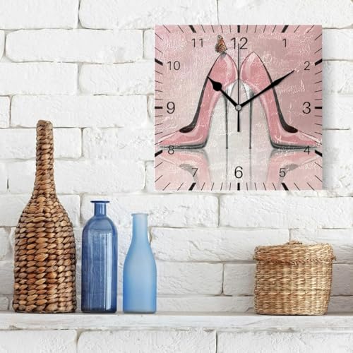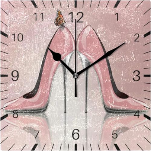 Generic - Butterfly High Heel Shoes Pink 7.9 Inch Square Wall Clock Battery Operated Non-Ticking Silent Quartz for Kitchen Home Living Room Office Bedroom(Black Pointer)