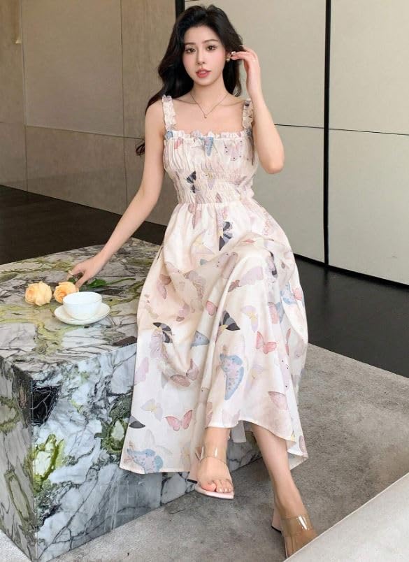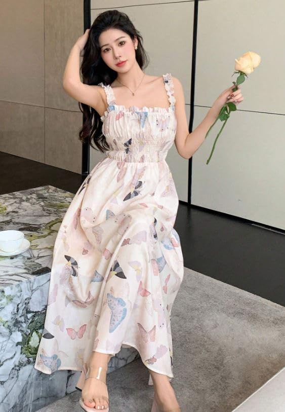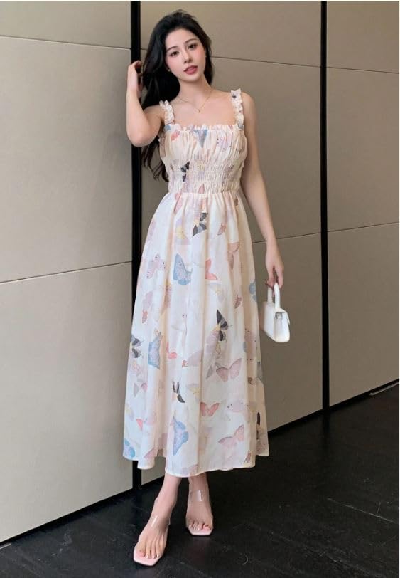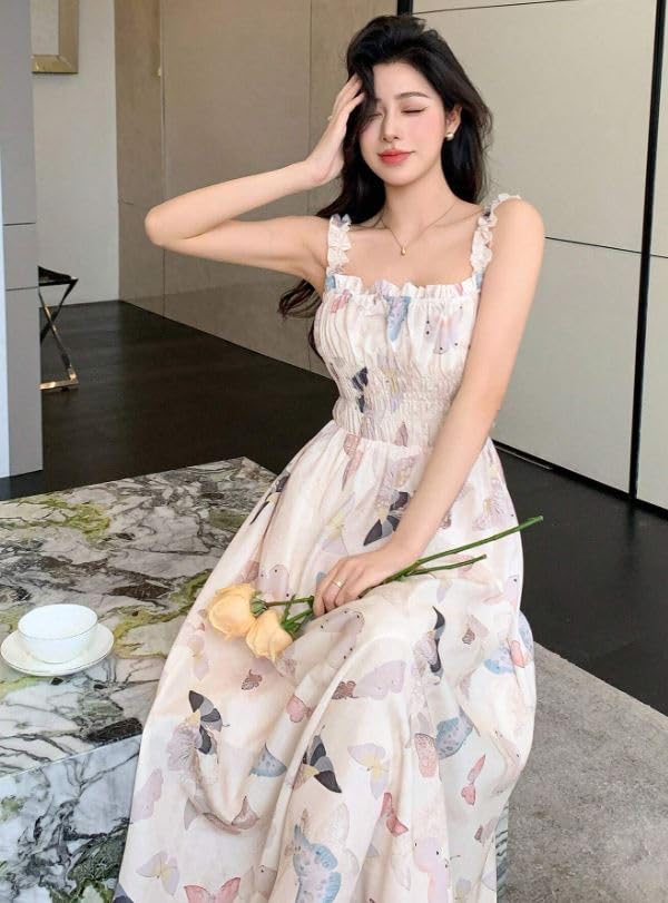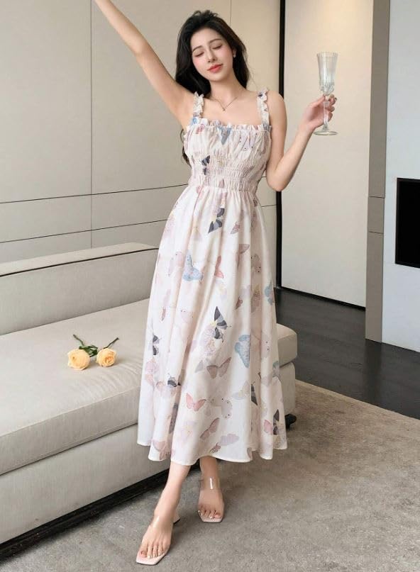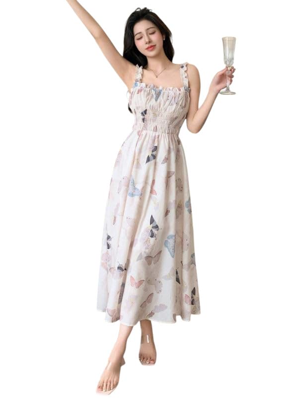 Generic - Butterfly Print Summer Maxi Dress, Smocked Bodice, Spaghetti Straps, White