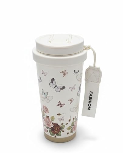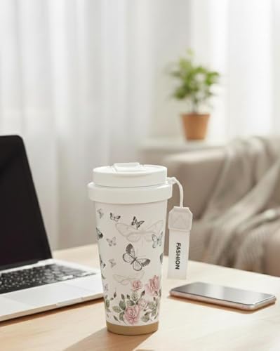 Spaceshoop - كوب سفر ستانلس ستيل بتصميم فراشة مع غطاء وحزام - كوب قهوة وشاي معزول بجدار مزدوج مع ماصة للمشروبات الساخنة والباردة، ثيرموس (1، ابيض، 520 مل)