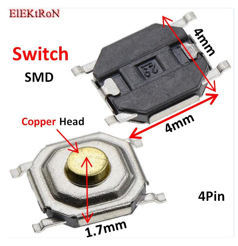 Generic - عدد 10 قطع من زر باور - Micro High performance Durable Tactile Push Button Momentary Switch Tact 4pin Copper Head Head Keys (4mm x 4mm x 1.7mm) SMD
