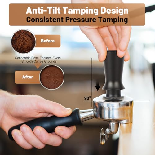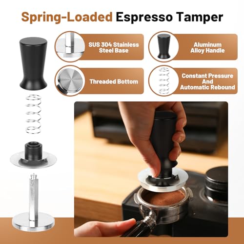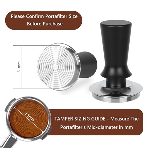 - 51mm Spring-Loaded Tamper - This 51mm espresso tamper is made of stainless steel and aluminum. It has a spring inside so you get the same amount of pressure when tamping your coffee grounds. This helps make your coffee extraction more even. The threaded bottom also helps control the water flow so the grounds get saturated evenly