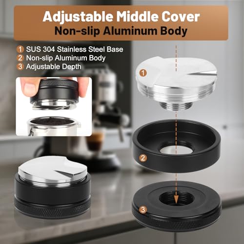 - 51mm Adjustable Distributor - This espresso distributor has a great feel with a detachable design, stainless steel base and non-slip aluminum body. Adjust the depth and height with the spiral mechanism to fit different portafilters or baskets. The 3 angled slopes efficiently and evenly distribute the coffee grounds for consistent tamping, improving control and consistency