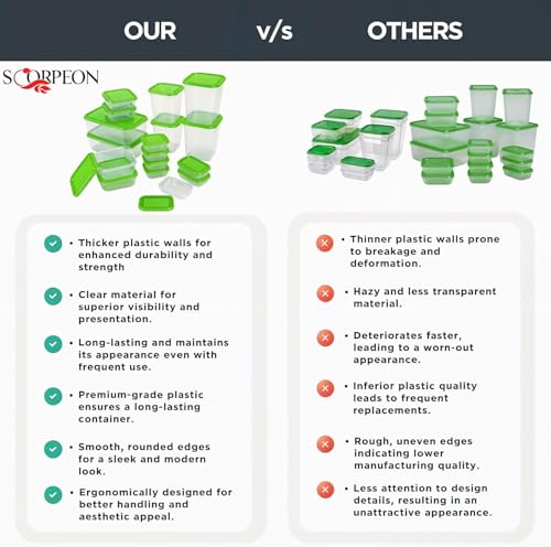- Microwave, Freezer, & Dishwasher Safe: Made with durable, food-safe plastic, our Scorpeon BPA-free containers are safe for use in the microwave (lid removed), dishwasher (top rack), and freezer. These reusable food containers are perfect for meal storage, reheating, and long-term freezing, making them an ideal choice for your day to day needs.