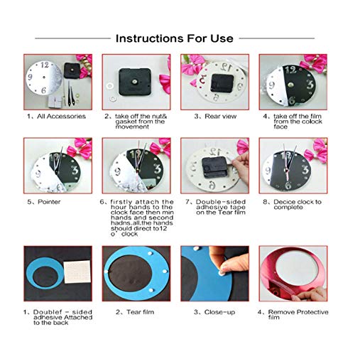 - ❥❥❥ سهلة الاستخدام - لا توجد أدوات إضافية مثل الغراء أو المسامير، والمرايا ومادة ايفا ذاتية اللصق، كما أنها تأتي مع موازين ومسامير لمساعدتك على التركيب بسرعة، يمكنك تصميم موضع الساعة وحجمها حسب رغبتك، والاستمتاع العائلة والأصدقاء بالصناعة اليدوية معًا.