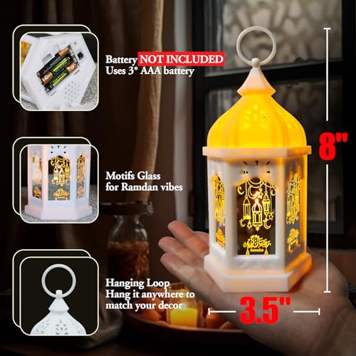 - 🌙[تعمل بالبطارية] - تعمل فوانيس رمضان المزخرفة بـ 3 بطاريات ايه ايه ايه (غير متضمنة)، وستومض الفوانيس عند تشغيل الطاقة!